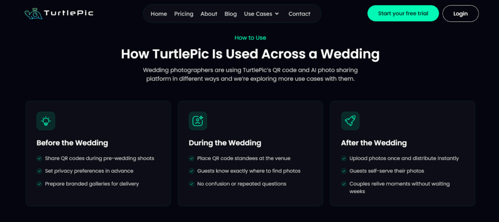 TurtlePic helps you do exactly that. With AI-powered photo discovery, privacy-first sharing, QR access, and real-time insights, it simplifies how wedding photos are delivered and experienced.